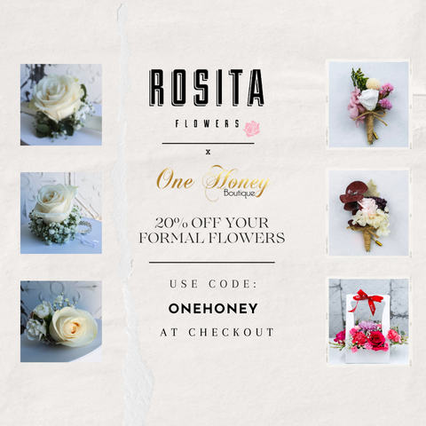 We’ve partnered with Rosita Flowers to offer One Honey customers an exclusive 20% OFF their stunning range of corsages, buttonholes, and formal flower bouquets. Whether you're after a delicate wrist corsage, a sleek pocket flower, or a luxe bouquet to match your gown, Rosita has the prettiest petals to elevate your entrance.