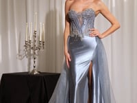 The Strapless Sweetheart Corset Bodice is adorned with radiant Crystal Appliqué and intricate beadwork that sculpts the waist and catches the light from every angle. The smooth Satin skirt hugs the figure beautifully, finished with a bold Thigh-High Leg Split for confident movement and modern glamour.