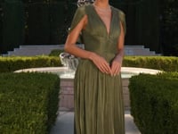 A deep V-Neckline is balanced by fluid Cap Sleeves that drape gently over the shoulders, creating a graceful, romantic frame. The softly Ruched Waistband defines the waistline before flowing into a floor-length skirt with airy pleats that move beautifully from ceremony to celebration. An open, draped back with a tie closure adds subtle drama while maintaining comfort and wearability.