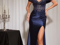 A luxe Off-the-Shoulder Neckline features soft draping that frames the shoulders beautifully, while the sheer Corset Bodice is adorned with shimmering Beading and Sequins that catch the light from every angle. The look is completed with an iridescent Stretch Satin Skirt that hugs the body effortlessly, finished with a bold Thigh-High Leg Split for movement and drama.