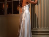 A striking Strapless Pointed V-Neckline creates a sleek, elongating effect, while the softly Gathered Waistline enhances the figure with subtle definition. A dramatic Leg Slit paired with a flowing Draped Sash adds movement and modern allure, making KAELIN the perfect balance of elegance and confidence.