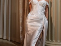 Crafted for the modern bride, this couture-inspired gown blends luxurious stretch satin with delicate beaded lace in a silhouette that celebrates femininity from every angle. A sculpted off-the-shoulder sweetheart neckline frames the décolletage, while the structured bustier corset bodice offers exceptional support and a figure-enhancing fit.